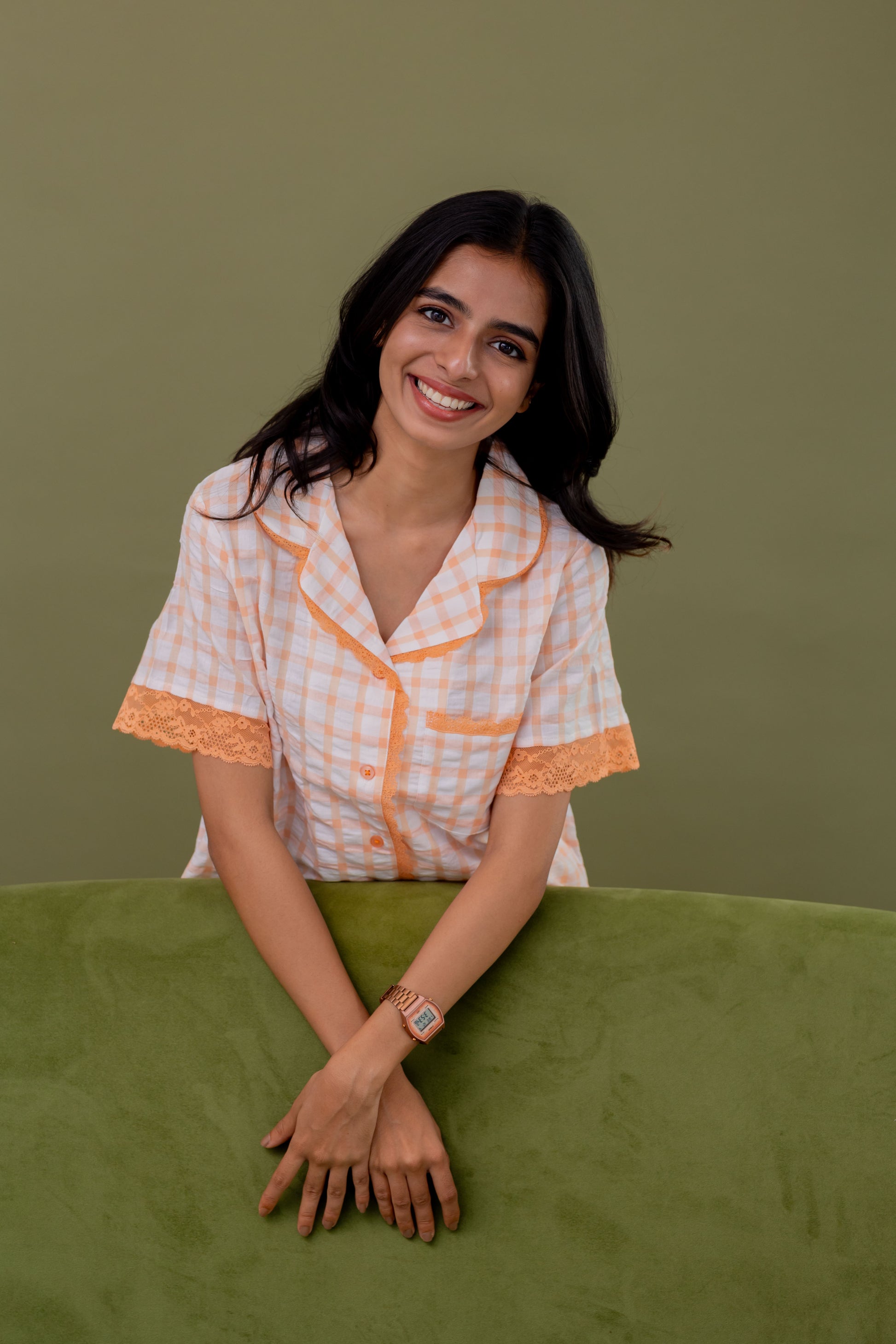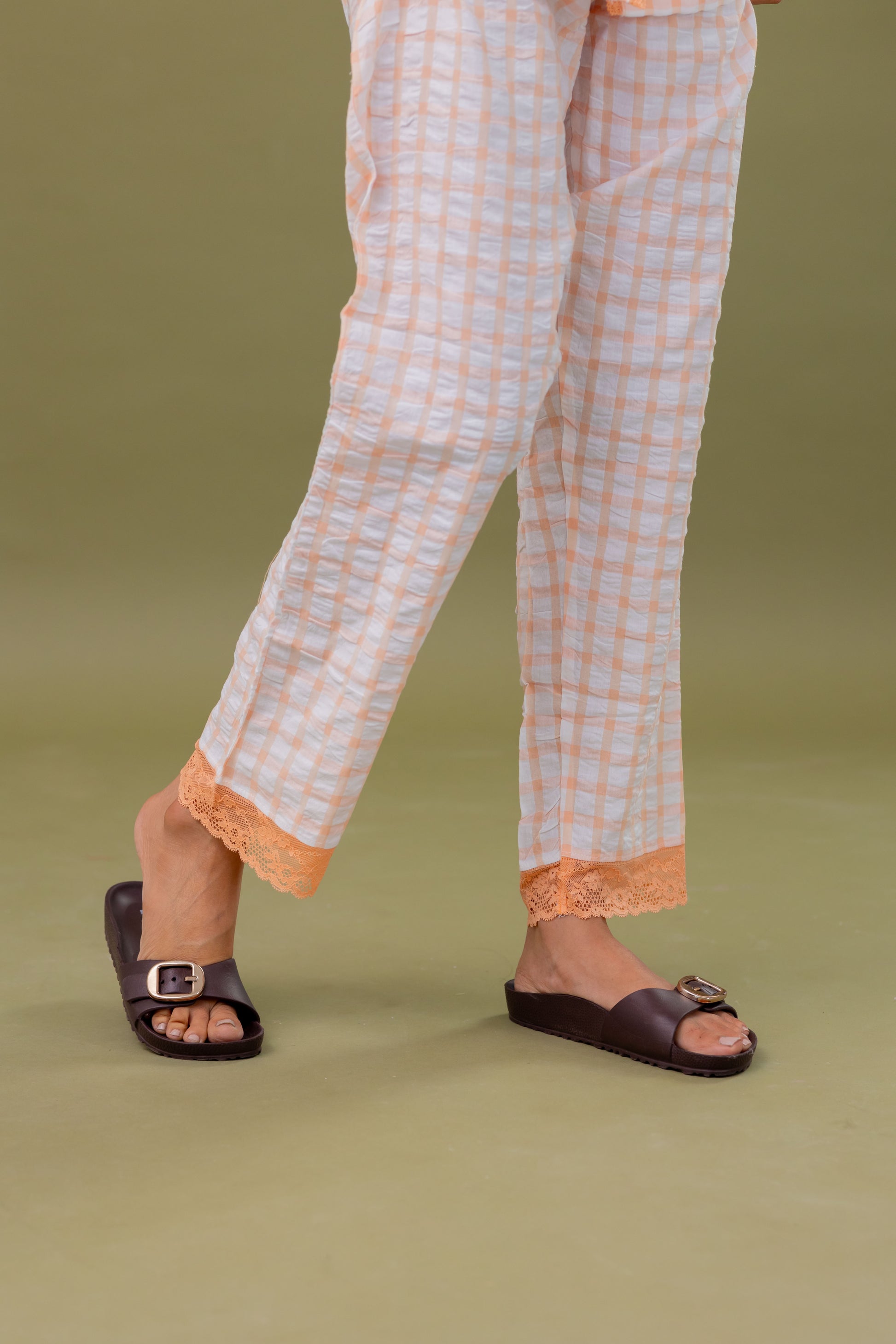 The Apricot Check Lounge Set is crafted from soft, breathable cotton with a subtle crinkled texture for relaxed comfort. Designed with a button-down top featuring a classic revere collar and delicate lace detailing on the sleeves, it adds a gentle feminine charm. The matching full-length pants are finished with lace-trimmed hems, creating a coordinated and elegant look. Perfect for lounging or sleepwear, this set blends warm pastel tones with everyday ease. FABRIC: 100% COTTON CATEGORY: WOVEN PYJAMAS |