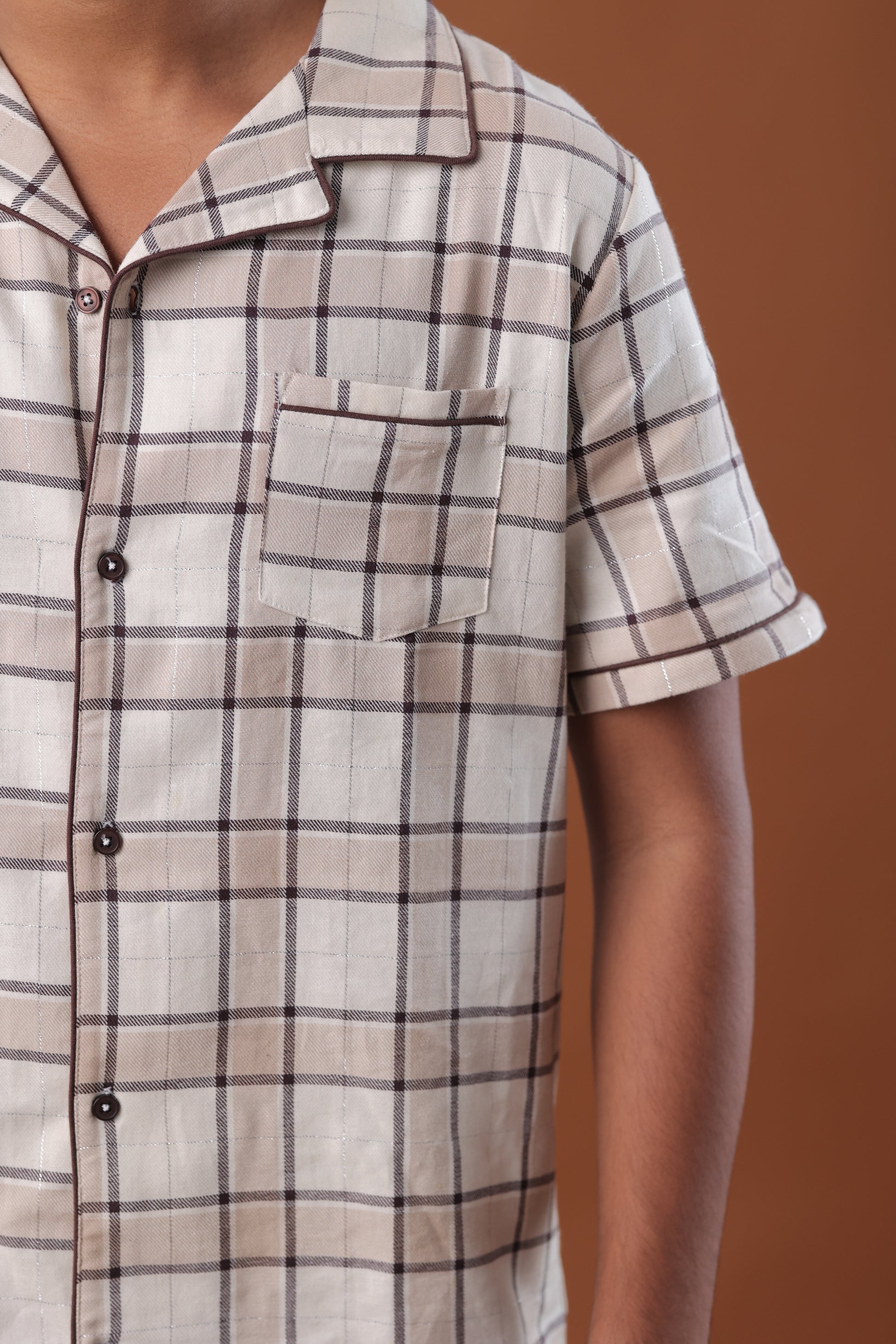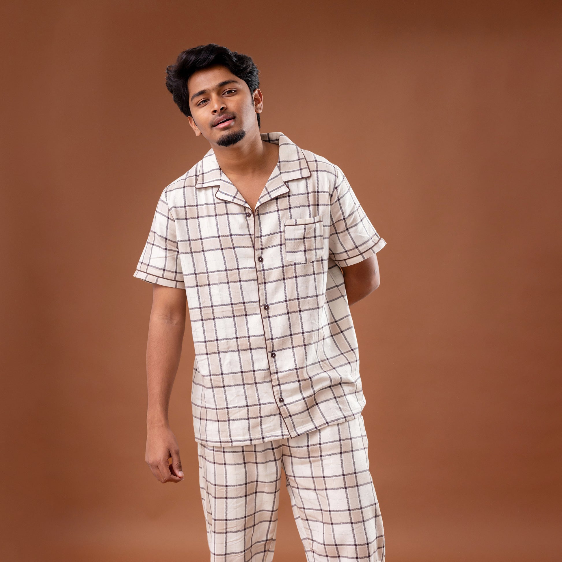 | Designed for everyday comfort with timeless appeal, the Beige Check Men’s Pyjamas delivers a relaxed yet polished look. Crafted from soft cotton, the set includes a shirt-style top with a revere collar, half sleeves, and a button-down front, paired with comfortable pyjama bottoms. Finished in a classic beige check pattern, it’s ideal for lounging, resting, and laid-back moments at home.
