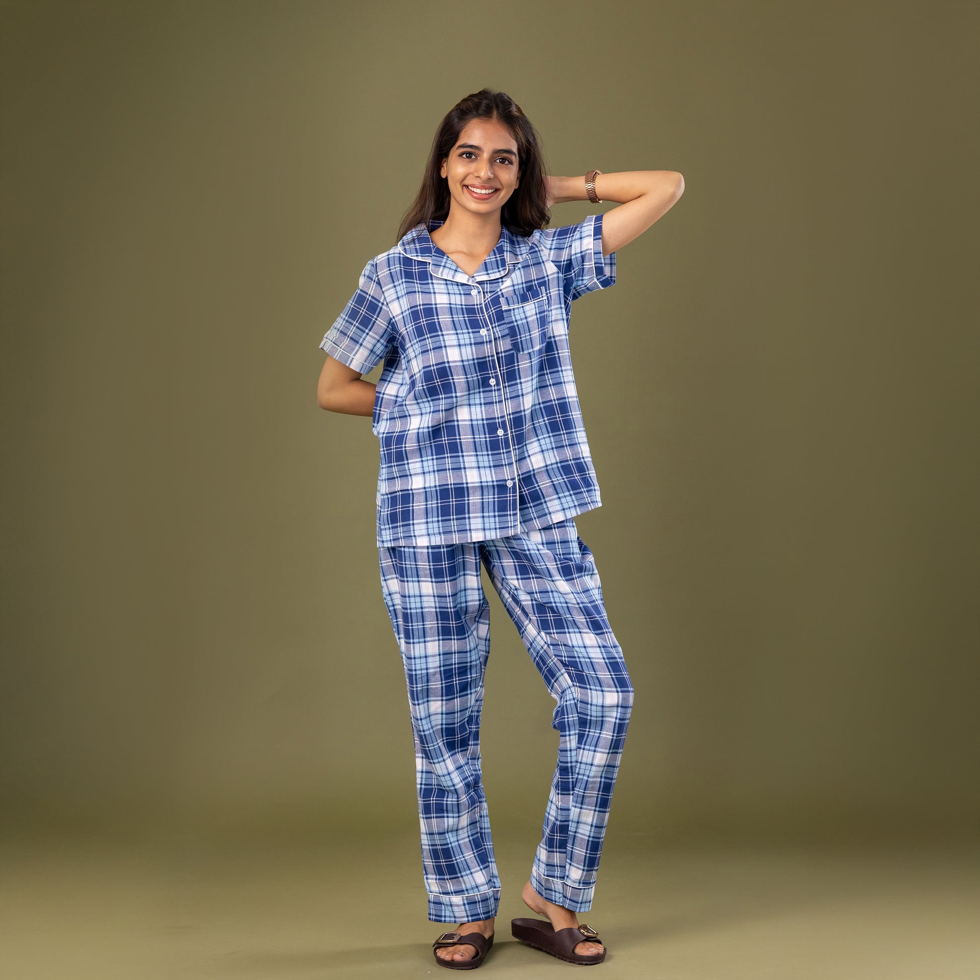 | Made for relaxed nights and cheerful mornings, the Blue Plaid Women’s Pyjamas blends comfort with effortless style. Crafted from breathable cotton, it features a classic revere collar, half sleeves, and a button-down shirt paired with easy-fit pyjama bottoms. The soft blue plaid pattern adds a calm, refreshing feel, making it ideal for lounging, sleeping, or unwinding at home. FABRIC: 100% COTTON CATEGORY: WOVEN FLANNEL PYJAMAS |