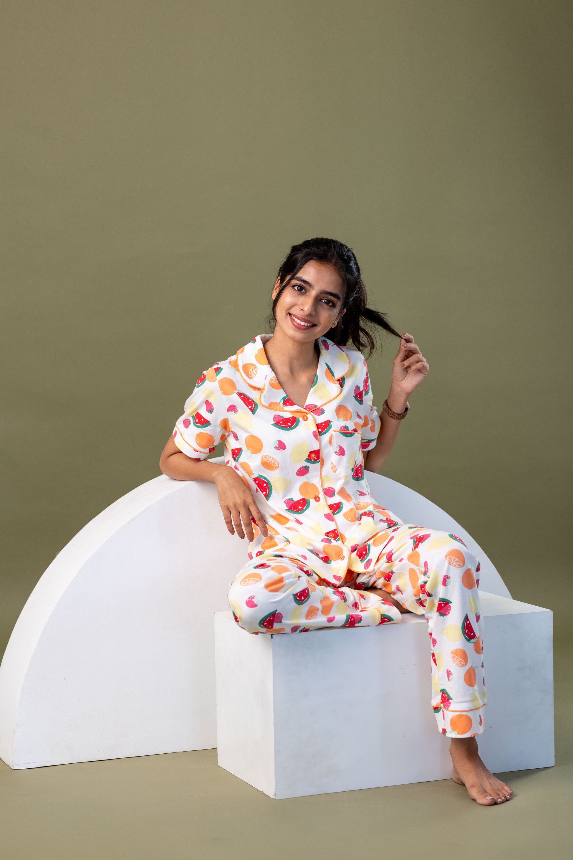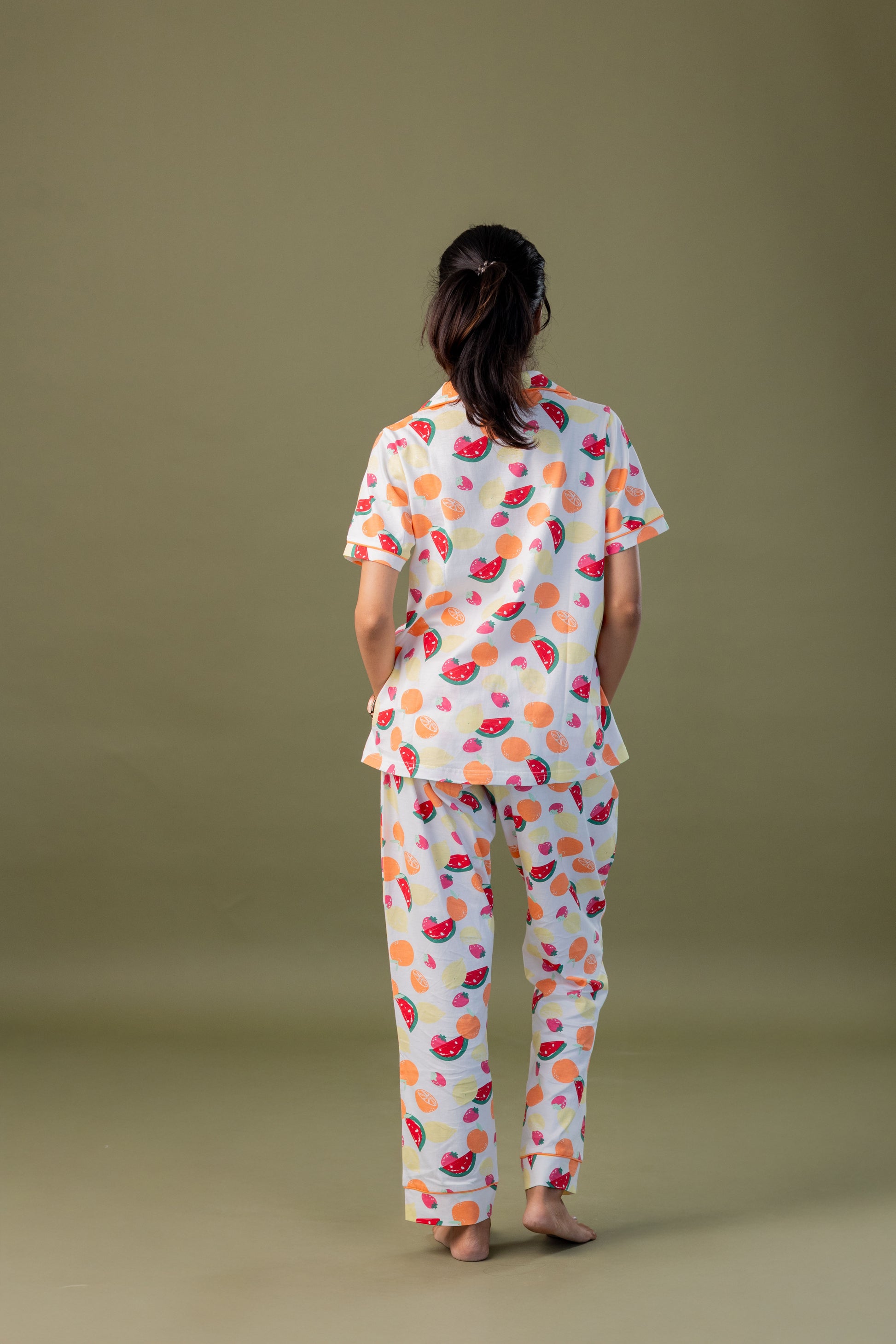 Featuring a bold fruit punch all-over print, this pyjama set radiates playful energy perfect for brightening your downtime. The classic revere collar top is trimmed with vibrant orange piping and includes a handy top pocket for your essentials. Pair it with the matching pants, complete with an orange cuff and two functional pockets. Embrace relaxation with a smile in this delightfully designed loungewear that celebrates your fun-loving spirit. Fabric - 100% Cotton Category - Knitted Pyjamas |