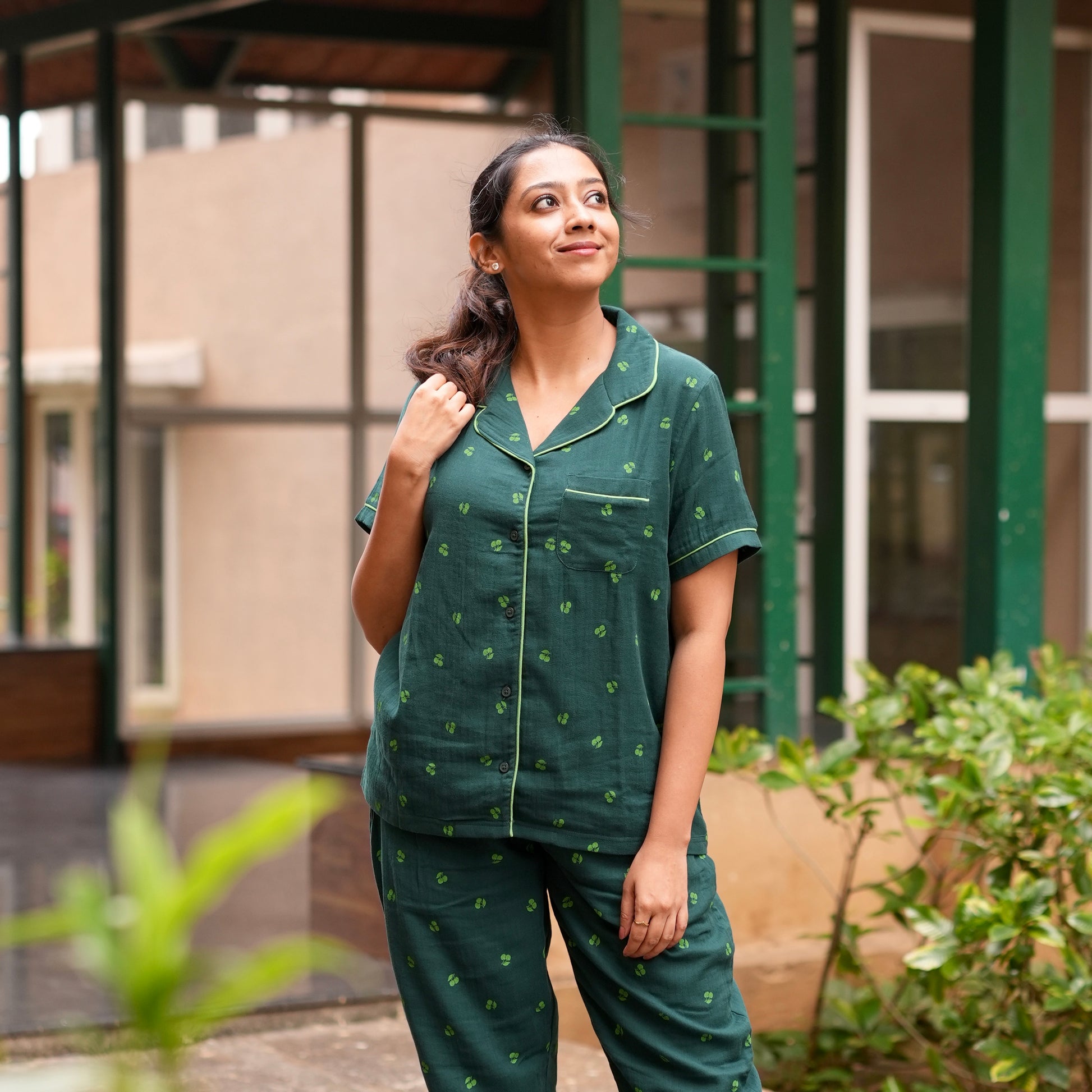 Experience relaxed elegance with these Emerald Green Muslin Pyjamas, crafted from soft, breathable muslin that feels feather-light on the skin. The design features a charming all-over clover motif that adds a subtle touch of personality. A classic revere collar nightwear outlined with bright contrast piping enhances the refined look, while the half sleeves keep it cool and comfortable for warm weather. Finished with a neatly piped pocket, this set blends style and comfort effortlessly—perfect for lounging or peaceful sleep. Fabric - 100% cotton muslin |