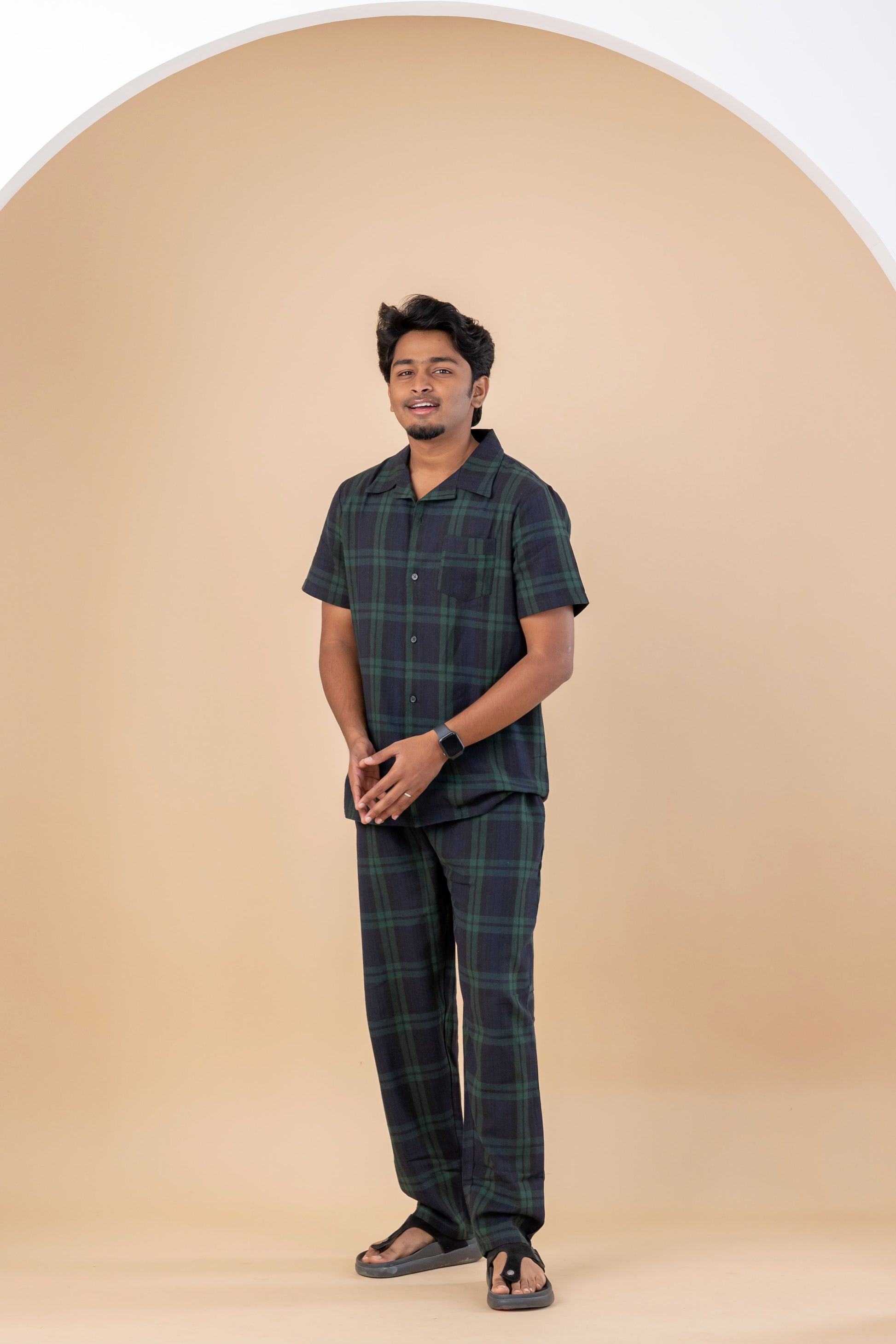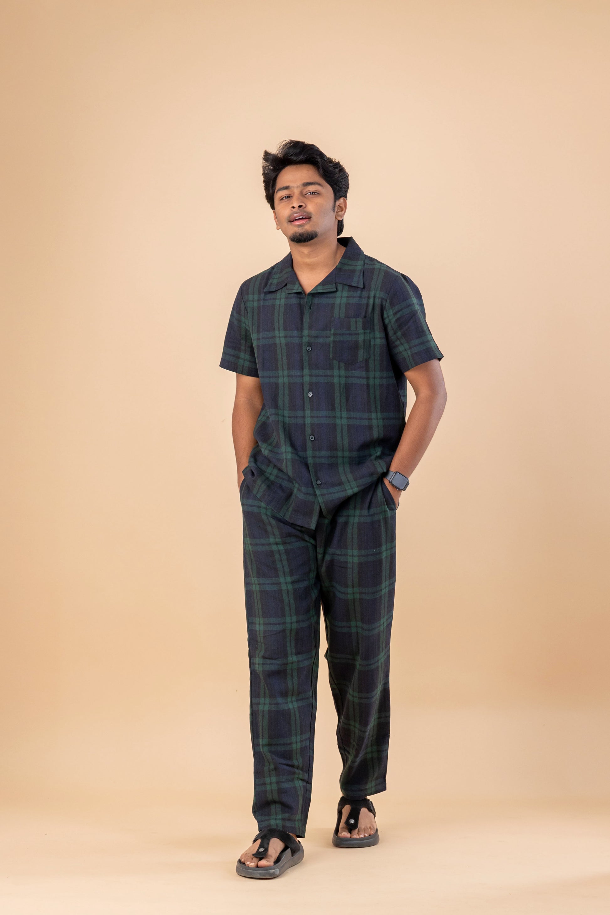 | Made for comfort without compromising on style, the Green Tartan Men’s Pyjamas offers a relaxed yet polished look. Crafted from breathable cotton, the set includes a shirt-style top with a revere collar, half sleeves, and a button-down front, paired with easy-fit pyjama bottoms for unrestricted comfort. Finished in a timeless green tartan pattern, this Pyjamas set is perfect for unwinding, lounging, or enjoying restful nights in classic style. FABRIC: 100% COTTON CATEGORY: WOVEN FLANNEL PYJAMAS |