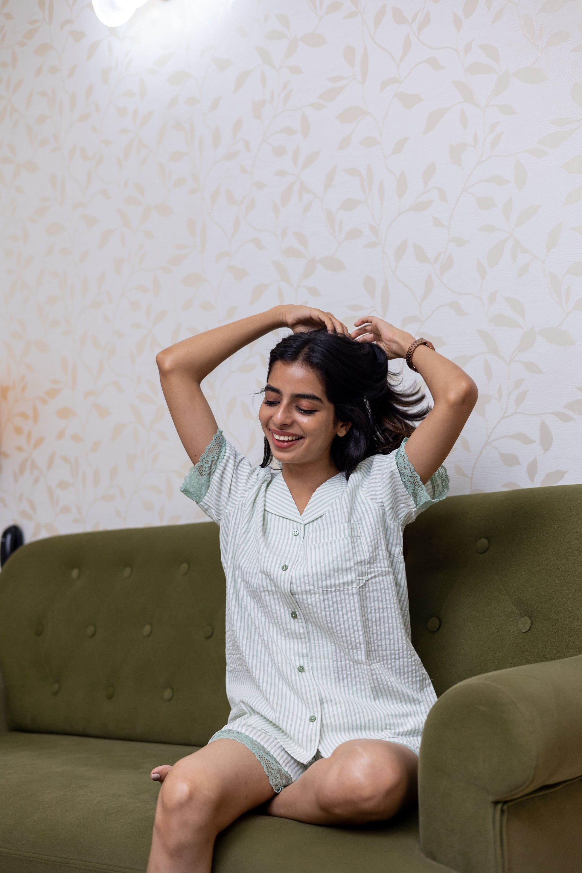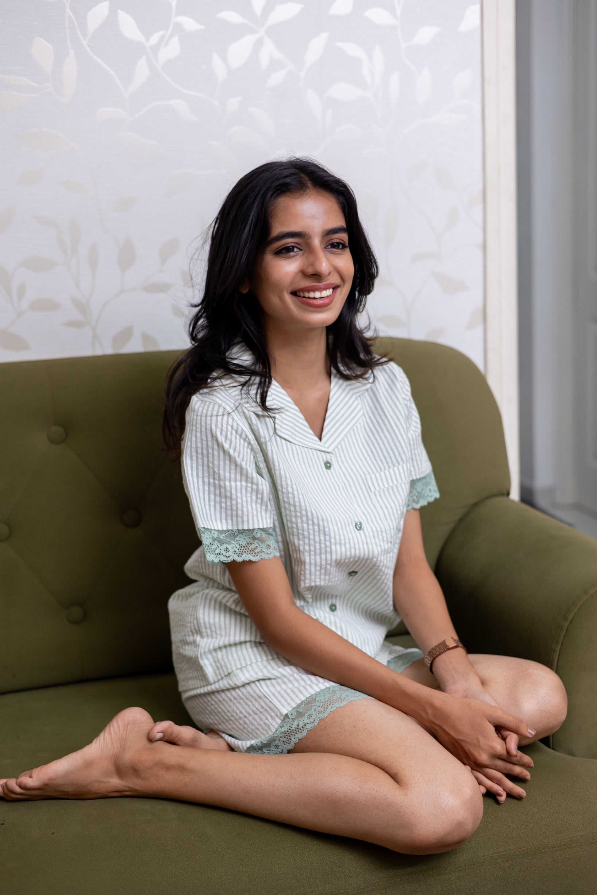 Crafted from soft, breathable cotton, the Mint Green lace Short Set offers relaxed comfort with a fresh, soothing feel. It features a button-down top with a classic revere collar, subtle vertical stripes, and delicate lace detailing on the sleeves. The matching shorts are finished with lace-trimmed hems, adding a gentle feminine touch. Perfect for lounging or sleepwear, this set combines everyday ease with effortless style. FABRIC: 100% COTTON CATEGORY: WOVEN PYJAMAS |