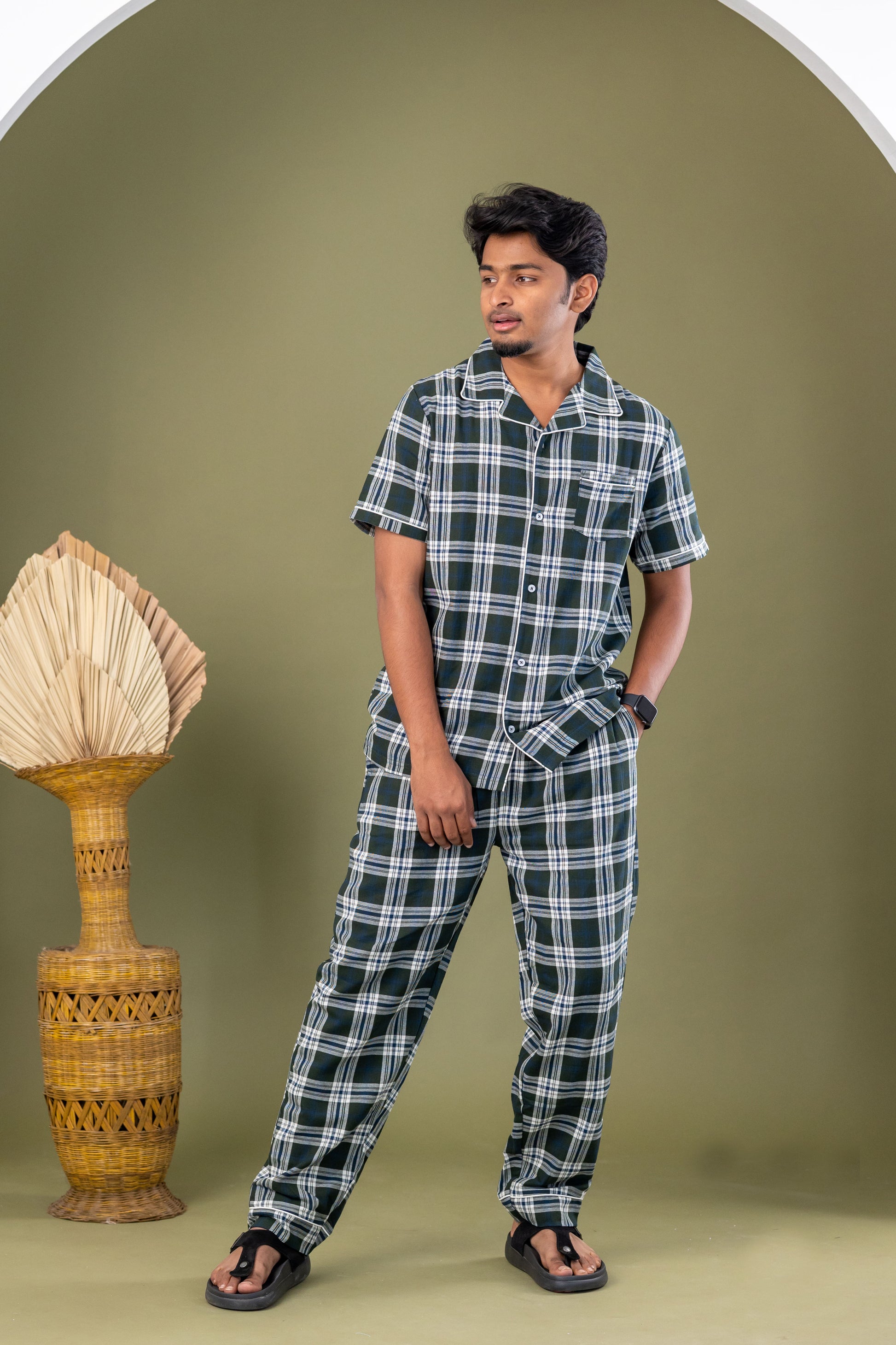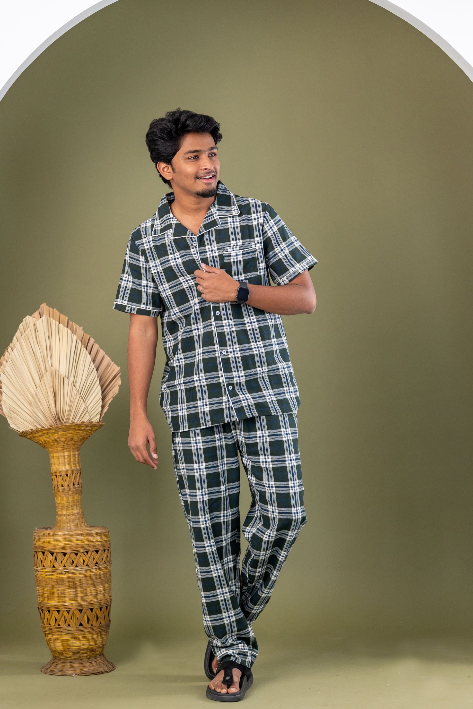 | Designed for everyday comfort with timeless style, the Olive Plaid Men’s Pyjamas offers a relaxed and polished look. Made from soft cotton, the set includes a shirt-style top with a revere collar, half sleeves, and a button-down front, paired with comfortable pyjama bottoms. Finished in a classic olive plaid pattern, it’s perfect for lounging, resting, and enjoying laid-back moments at home. FABRIC: 100% COTTON CATEGORY: WOVEN FLANNEL PYJAMAS |