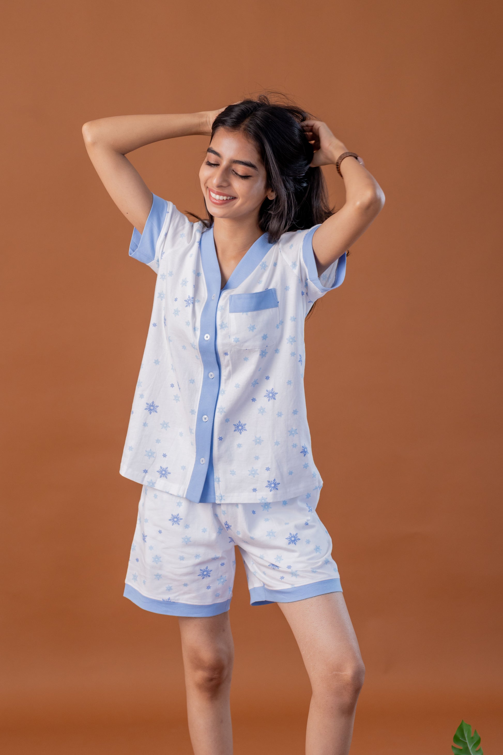 Stay cool and carefree in this short set featuring a sky‑blue star print on a fresh white base. The contrast cuffs and neckline, frame the button‑down top beautifully, while mid‑thigh shorts with pockets make it perfect for both lounging and quick daytime errands. Fabric: 100% Cotton Category: Knitted Pyjamas |